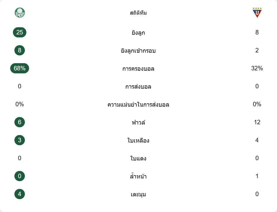 พัลไมรัสครองบอลเหนือกว่าอย่างชัดเจนถึง 68% มีโอกาสยิงถึง 25 ครั้ง เข้ากรอบ 8 ครั้ง และทำได้ 4 ประตู ขณะที่แอลดียู กีโต้มีเพียง 8 ครั้ง เข้ากรอบแค่ 2 ครั้งเท่านั้น ทีมเยือนโดนบีบจนต้องตัดฟาวล์ถึง 12 ครั้งและโดนใบเหลืองถึง 4 ใบ ส่วนเจ้าบ้านคุมเกมได้หมดจดและแทบไม่มีจังหวะให้โดนโต้กลับ
