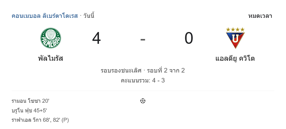 - ⚽ 20’ รามอน โซซ่า ยิงให้พัลไมรัสนำ 1-0
