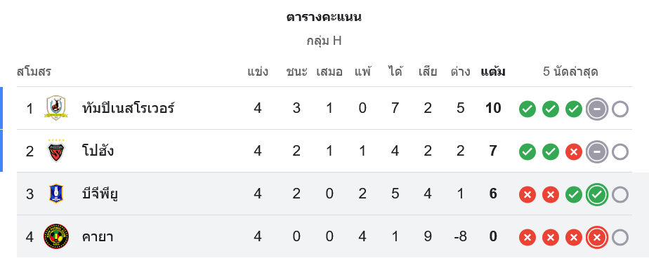 📈 สถานการณ์ในตารางคะแนน เอเอฟซี แชมเปี้ยนส์ลีก อีลิท ทู กลุ่ม H