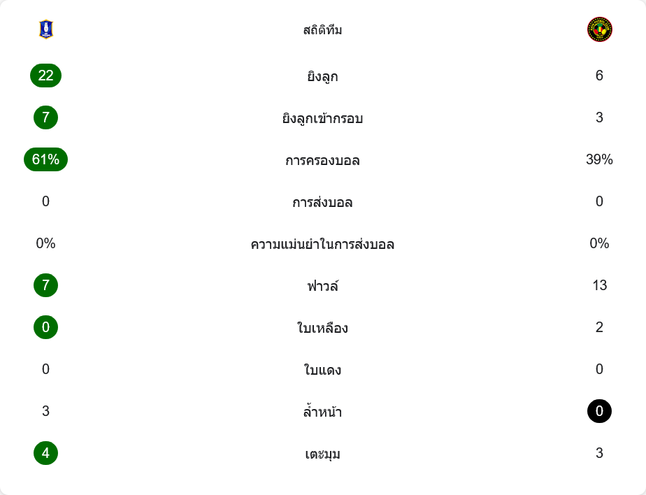 ตัวเลขหลังเกมยืนยันภาพในสนามแบบไม่ต้องเถียงกัน บีจีปทุมกดดันตลอด 90 นาที มีโอกาสยิงรวม 22 ครั้ง เข้ากรอบ 7 ครั้ง ขณะที่คายายิงเพียง 6 ครั้ง เข้ากรอบ 3 ครั้งเท่านั้น การครองบอลเจ้าถิ่นเหนือกว่าชัดเจนที่ 61% ต่อ 39% แปลว่าบีจีควบคุมจังหวะเกมได้แทบตลอด ทั้งในช่วงที่นำและช่วงที่ต้องเซฟสกอร์ในครึ่งหลัง