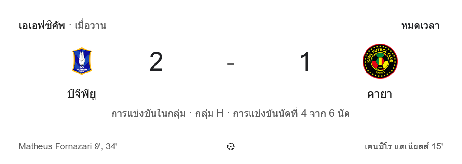 ศึก เอเอฟซี แชมเปี้ยนส์ลีก อีลิท ทู กลุ่ม H นัดที่ 4 แฟนบีจีที่กดเช็ก ผลบอลสด กันทั้งเมืองได้เฮสมใจ เมื่อ บีจี ปทุม ยูไนเต็ด เปิดรังอัดตัวแทนจากฟิลิปปินส์อย่าง คายา เอฟซี 2-1 จากสองประตูของหัวหอกจอมคม Matheus Fornazari เก็บสามแต้มสำคัญ ไล่กดดันสองทีมนำกลุ่มแบบหายใจรดต้นคอ