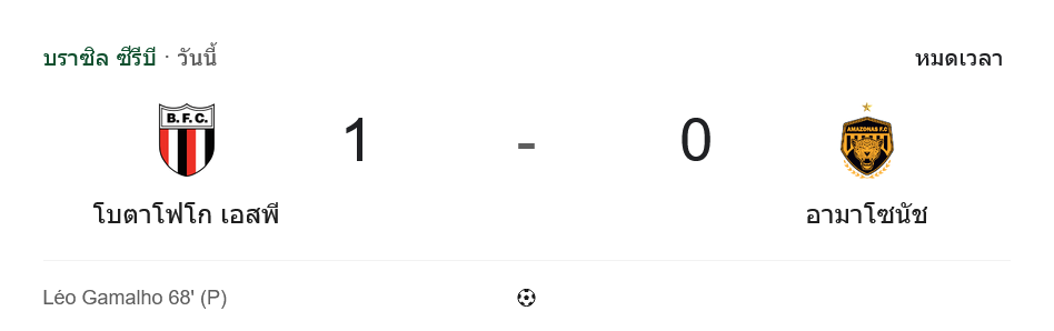 ศึก คัมปิโอนาโต บราซิเลียโร ซีรีบี เกมที่โบต้าโฟโก้ เอสพี เปิดรังรับอมาโซนัส จบลงด้วยชัยชนะสำคัญ 1-0 จากจุดโทษของ เลโอ กามาลโญ นาทีที่ 68 ช่วยให้เจ้าถิ่นเก็บสามแต้มล้ำค่าในบ้าน ส่วนทีมเยือนยังจมพื้นที่อันตรายต่อไป เกมนี้แฟนบอลที่ตามเช็กสกอร์แบบ ผลบอลสด และหน้าเว็บ บ้านผลบอล ต้องลุ้นกันยาวจนทดเจ็บท้ายเกมกว่าจะรู้ผลจริงๆ