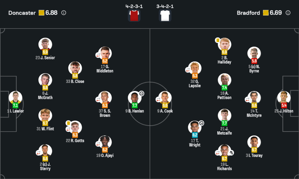 ดอนคาสเตอร์ยืน 4-2-3-1 เน้นสปีดริมเส้นกับการทำชิ่งช่องครึ่ง spaces ระหว่างวิงแบ็กแบรดฟอร์ดกับเซ็นเตอร์ การขยับของ Hanlan ดึงตัวประกบ เปิดพื้นที่ให้ Gibson (ลงมาครึ่งหลัง) แทงทะลุแนวระหว่างไลน์อย่างต่อเนื่อง เกมรับใช้บล็อก 4-4-2 ยามไม่มีบอล ไล่เพรสครั้งแรกบริเวณเส้นครึ่งสนามเพื่อตัดทรานซิชันเร็ว เมื่อแย่งได้จะสวนกลับด้วยบอลหนึ่ง-สองทางขวา (Molyneux, Senior) และการยัดเข้าครอสเร็ว ทำให้จังหวะจบสกอร์คมขึ้นในครึ่งหลัง
