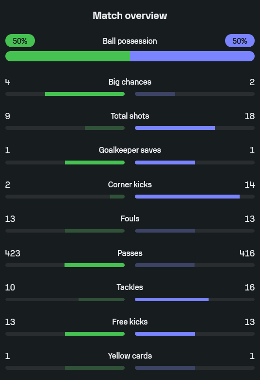 เกมนี้ครองบอล 50-50 แต่รูปแบบโอกาสต่างกัน ดอนคาสเตอร์มี บิ๊กชานซ์ 4 ครั้ง จากการสวนคมและเจาะแนวครึ่งช่อง แม้จะยิงรวมเพียง 9 ครั้ง ทว่าความแม่นยำสูง ตรงกันข้าม แบรดฟอร์ดครอสใส่ไม่หยุดจนได้ เตะมุมถึง 14 ครั้ง ยิงรวม 18 ครั้ง แต่คุณภาพช็อตไม่พอ ผ่านมือ Lawlor ไปได้แค่หนเดียว เรื่องการดวลกลางสนามใกล้เคียง ฟาวล์เท่ากัน 13-13 จ่ายบอลสูสี 423 ต่อ 416 และใบเหลืองทีมละหนึ่ง