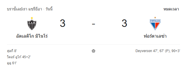 ผลบอลสด กังเปโอนาตู บราซีเลย์รู แซรียีอา ระหว่าง อัตเลติโก มิไนโร่ 3-3 ฟอร์ตาเลซ่า วันนี้ 13/11/68
