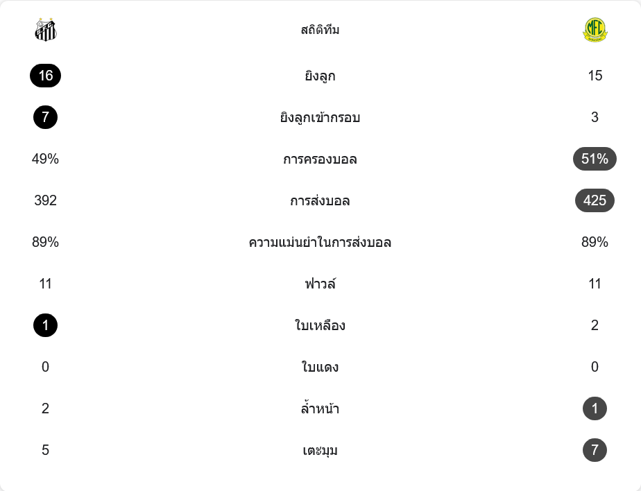 แม้ผลจบเสมอ แต่ตัวเลขในสนามบอกชัดว่าซานโตสทำเกมรุกได้มากกว่าเล็กน้อย พวกเขายิงทั้งหมด 16 ครั้ง เข้ากรอบ 7 ครั้ง ส่วนมิราสโซลยิง 15 ครั้ง เข้ากรอบ 3 ครั้ง แสดงให้เห็นว่าเจ้าถิ่นมีโอกาสลุ้นประตูแบบจัง ๆ มากกว่า