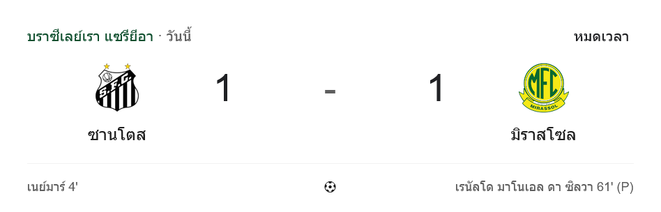 ศึกกัมเปโอนาตู บราซิเลย์โร ซีรีเอ คู่เดือดที่แฟนบอลติดตามผ่าน ผลบอลสด และหน้าเว็บ บ้านผลบอล อย่างใกล้ชิด ซานโตส เปิดรังรับมือ มิราสโซล ทีมฟอร์มแรงกลุ่มบนตาราง เกมนี้มีทั้งประตูเร็ว ดราม่า VAR และจุดโทษท้าย ๆ ที่เปลี่ยนรูปเกมให้กลับมาสมดุล ก่อนจบลงด้วยผลเสมอ 1-1 แบ่งกันไปทีมละแต้ม แต่ความหมายนอกสนามต่างกันชัดเจน เพราะมิราสโซลยังเกาะกลุ่มท็อปโฟร์ ส่วนซานโตสยังต้องหนีโซนแดงต่อไป