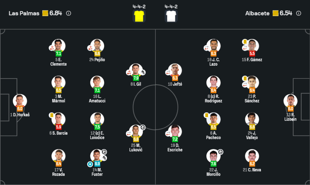 - 🔁 68′ – อัลบาเซเต้เปลี่ยนสามคนรวด ส่ง Jonathan Gómez, Lorenzo Aguado และ Antonio Puertas ลงแทน F. Gámez, P. Sánchez และ Jefté