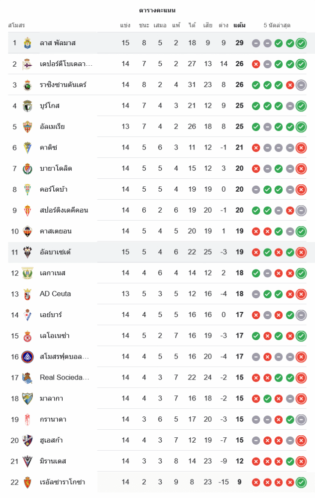 ด้าน อัลบาเซเต้ แข่งครบ 15 นัด มี 19 คะแนน จากสถิติชนะ 5 เสมอ 4 แพ้ 6 ประตูได้ 22 เสีย 25 อยู่กลางตารางอันดับ 11 ประตูได้เสียติดลบเล็กน้อย สะท้อนชัดว่าเกมรับยังมีปัญหา หากไม่รีบแก้ไขอาจหลุดไปอยู่โซนล่างในช่วงครึ่งฤดูกาลหลังได้ง่าย ๆ