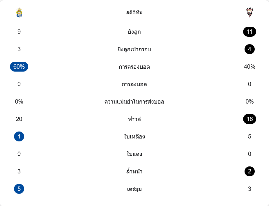 เปิดเกมมา ลาส พัลมาส ใช้การต่อบอลสั้นและจังหวะโยนเร็วจากริมเส้นกดดันแนวรับอัลบาเซเต้อย่างต่อเนื่อง แม้สถิติการยิงรวมจะเป็นรองในภาพรวม แต่จังหวะเข้าทำของเจ้าถิ่นเฉียบขาดมาก