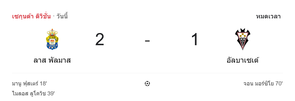 - ⏱️ FT – จบเกม ลาส พัลมาส ชนะ อัลบาเซเต้ 2-1