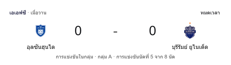 • ⏱ ช่วงทดเวลา: ทั้งสองทีมเปิดหน้าแลก แต่ยังหาทางส่งบอลผ่านมือเอเธอริดจ์และแนวรับอุลซานไม่ได้ จบเกม 0-0