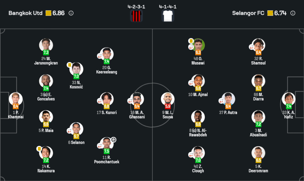 📋 รายชื่อนักเตะตัวจริง, คะแนน และการเปลี่ยนตัว