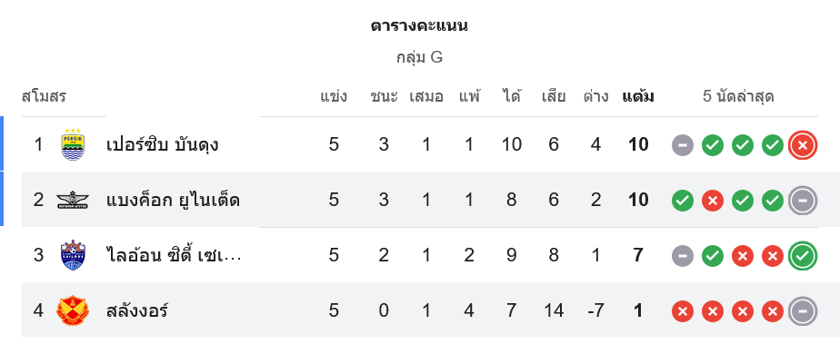 📊 สถานการณ์ตารางคะแนน เอเอฟซี แชมเปี้ยนส์ ลีก ทู กลุ่ม G