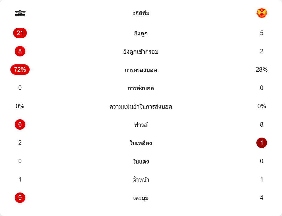ตัวเลขในเกมนี้เทไปทางเจ้าบ้านแทบทุกช่อง แบงค็อก ยูไนเต็ด ยิงรวม 21 ครั้ง เข้ากรอบ 8 ครั้ง ครองบอลราว 72% ได้ลูกเตะมุมถึง 9 ครั้ง ทำฟาวล์ 6 ครั้ง มีใบเหลือง 2 ใบ ขณะที่เซลังงอร์ยิงเพียง 5 ครั้ง เข้ากรอบ 2 ครั้ง ครองบอลแค่ 28% ฟาวล์ 8 ครั้ง และได้ใบเหลือง 1 ใบ