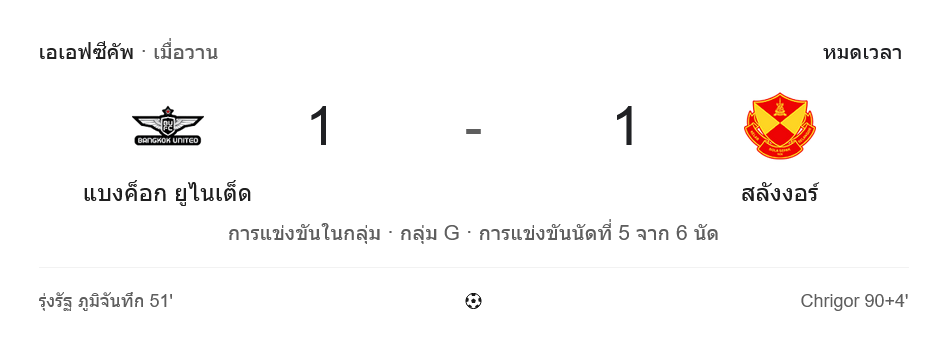 ศึกฟุตบอลเอเอฟซี แชมเปี้ยนส์ ลีก ทู ฤดูกาล 2025-2026 รอบแบ่งกลุ่ม กลุ่ม G ทรู แบงค็อก ยูไนเต็ด เปิดบ้านรับ เซลังงอร์ เอฟซี เกมนี้ “แข้งเทพ” เล่นเหนือกว่าทุกอย่างทั้งรูปเกมและสถิติ จนคนเช็ก ผลบอลสด คิดว่าชนะใส แต่สุดท้ายดันมาโดนตีเสมอในช่วงทดเวลาบาดเจ็บ นาที 90+4 จบเกมสุดช็อก 1-1 กลายเป็นดราม่าที่ทำเอาแฟนเจ้าถิ่นเซ็งกันทั้งสนาม