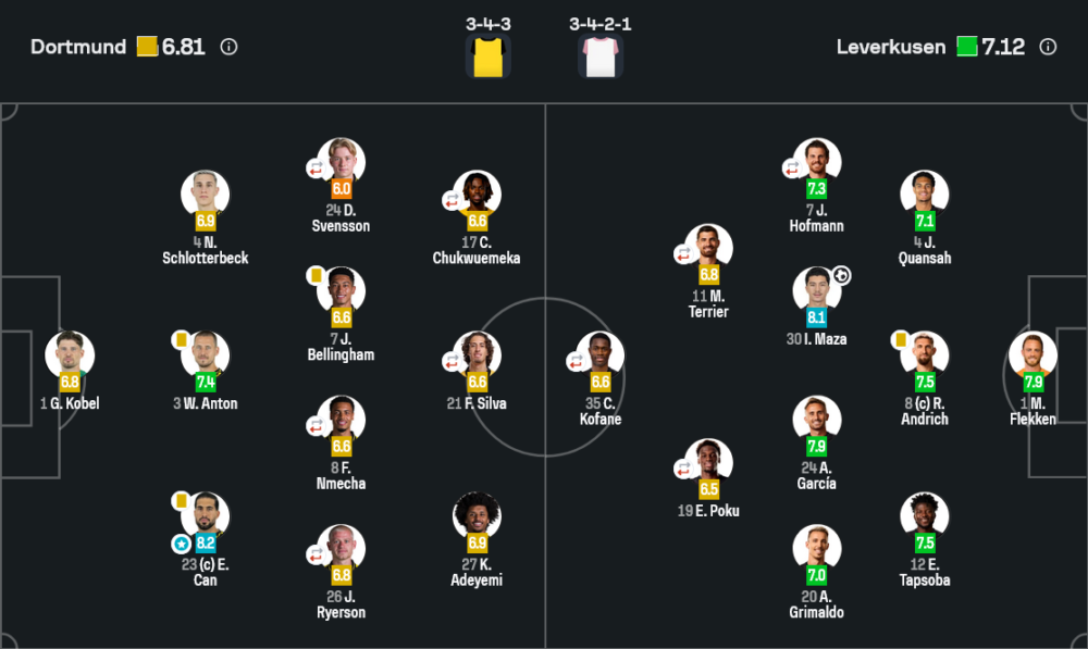 ฝั่งเลเวอร์คูเซินใช้ 3-4-2-1 แบบยืดหยุ่น เวลาไม่มีบอลจะยุบลงเป็น 5-4-1 อัดแน่นหน้ากรอบเขตโทษ ตัดช่องจ่าย และบีบให้ดอร์ทมุนด์ต้องยิงไกล การ์เซียกับอันดริชช่วยกันสกรีนหน้าแผงหลังได้ยอดเยี่ยม ขณะที่ควอนซาห์กับทัพโซบาคุมโซนโหม่งสกัดแทบไม่พลาด เมื่อได้บอลจึงออกบอลจากหลังสู่แดนบนภายในสองจังหวะ โดยใช้ มาซา เป็นตัวเชื่อมเกมระหว่างกลางกับหน้า คอยพักบอล พลิกจ่ายออกปีกหรือแทงทะลุให้ ตือร์ริเยร์ และโพคู สปีดหนีแนวรับเจ้าถิ่น