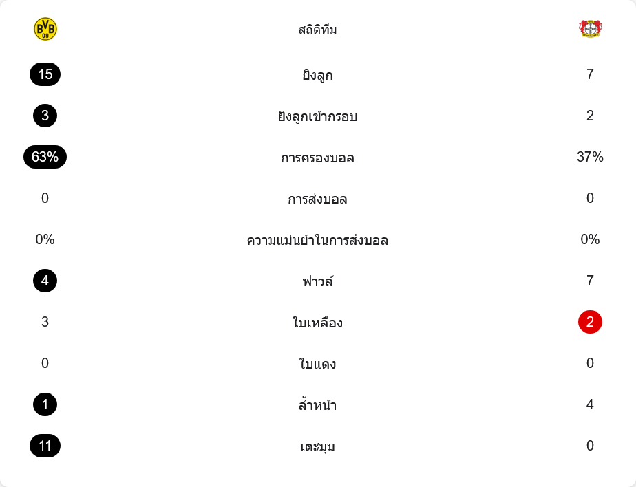 ตลอด 90 นาที ดอร์ทมุนด์ครองบอลราว 58% ต่อ 42% แสดงชัดว่าพวกเขาคุมจังหวะเกมอยู่หมัด ยิงทั้งหมด 20 ครั้ง มากกว่าเลเวอร์คูเซินที่ยิงเพียง 6 ครั้ง แต่จำนวน “โอกาสทอง” กลับใกล้เคียงกันที่ 3 ต่อ 1 และฝ่ายที่เฉียบคมกว่าก็คือทีมเยือน