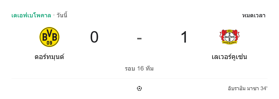 ศึกถ้วยเดเอฟเบ โพคาล รอบ 16 ทีมที่ซิกนัล อิดูน่า พาร์ค กลายเป็นค่ำคืนขมขื่นของแฟนเจ้าถิ่น เมื่อ ดอร์ทมุนด์ ครองบอลบุกใส่แทบทั้งเกม แต่จบไม่คม แพ้ให้กับความเฉียบของ เลเวอร์คูเซิน ที่มาได้ประตูโทนจากดาวรุ่งอย่าง อิบราฮิม มาซา ตั้งแต่นาที 34 ทำให้สกอร์สุดท้ายบนหน้าเว็บ ผลบอลสด และจอ บ้านผลบอล จบลงที่ 0-1 ส่ง “ห้างขายยา” ทะลุรอบก่อนรองฯ ส่วน “เสือเหลือง” ตกรอบแบบสุดเจ็บ