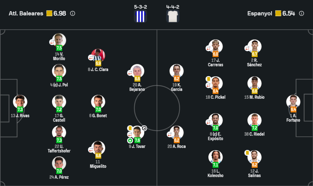 ตำแหน่งยอดเยี่ยมของเกมนี้หนีไม่พ้น ฆาอูเม โตบาร์ กองหน้าตัวความหวังของแอตเลติโก บาเรียเรส ที่คว้าเรตติ้งสูงสุด 7.6 จากการเคลื่อนที่ฉลาดตลอด 54 นาทีในสนาม เขาใช้สปีดและไลน์วิ่งตัดแนวรับเอสปันญ่อลได้ตลอด ก่อนจะมาปิดทองหลังพระด้วยประตูโทนที่ตัดสินเกม ไม่เพียงเท่านั้น โตบาร์ยังช่วยเพรสและไล่บีบกองหลังทีมเยือนจนเสียจังหวะหลายครั้ง สมควรอย่างยิ่งกับการถูกเลือกเป็น Player of the Match ในค่ำคืนนี้