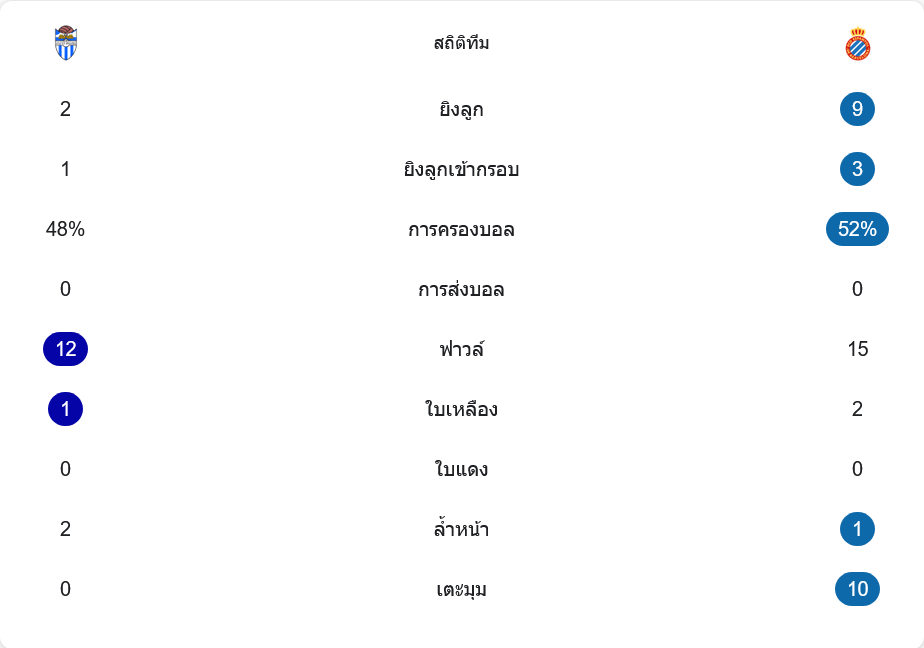 เกมนี้มีฟาวล์รวมกันถึง 27 ครั้ง บาเรียเรสทำ 12 ครั้ง เอสปันญ่อล 15 ครั้ง บ่งบอกถึงจังหวะปะทะดุเดือดทั้งสนาม ใบเหลืองฝั่งเจ้าบ้าน 1 ใบ (โตบาร์) ส่วนทีมเยือนโดนไป 2 ใบ (พิเคล, ซาลีนาส) ลูกล้ำหน้าบาเรียเรส 2 ครั้ง เอสปันญ่อล 1 ครั้ง อีกสถิติที่สะท้อนรูปเกมชัดเจนคือเตะมุม เจ้าบ้านไม่มีเตะมุมเลย ขณะที่เอสปันญ่อลได้ถึง 10 ครั้ง แต่ก็ไม่สามารถเปลี่ยนให้เป็นประตูได้แม้แต่ครั้งเดียว
