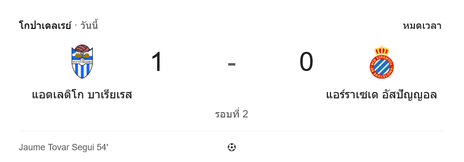 ศึกฟุตบอลถ้วย โกปาเดลเรย์ รอบสอง เกมนี้ “ทีมลีกล่างจากเกาะมายอร์กา” แอตเลติโก บาเรียเรส เปิดรังรับมือยักษ์ใหญ่จากลาลีกาอย่าง เอสปันญ่อล จบ 90 นาทีสกอร์บนจอแบบเรียลไทม์ในหน้า ผลบอลสด ช็อกแฟนบอลทั้งสเปน เมื่อเจ้าถิ่นเฉือนชนะ 1-0 จากประตูโทนของ ฆาอูเม โตบาร์ นาที 54 บ้านกีฬา ขอย้ำอีกครั้งว่านี่คือการหักปากกาเซียนเต็ม ๆ