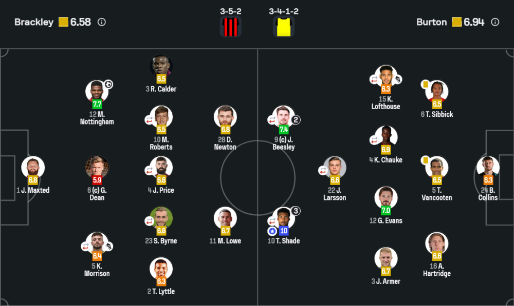 ฝั่งเบอร์ตันในระบบ 3-4-1-2 โหดตรงที่ใช้เชดยืนกองหน้าฝั่งซ้ายหุบเข้ากลาง บีสลีย์เป็นตัวพักบอล ส่วนลาร์เซสันคอยยืนระหว่างไลน์แนวรับกับกองกลางของแบรกเลย์ ทำให้การต่อบอลทะลุช่องอันตรายตลอด เกมรุกด้านขวาใช้ลอฟท์เฮาส์ดันสูงซ้อนกับซิบบิก ช่วยดึงตัวประกบเปิดช่องให้เชดวิ่งสอดเข้าไปยิง ซึ่งทั้งสามประตูของเบอร์ตันมาจากการเคลื่อนที่ประสานกันแบบนี้แทบทั้งหมด
