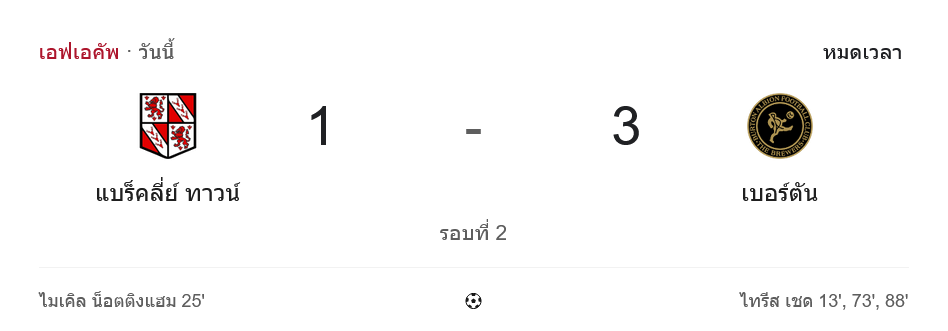 ศึกเอฟเอคัพ รอบสอง ที่สนามเซนต์เจมส์ พาร์ก กลายเป็นคืนของทีมเยือนจากลีกวันอย่างเบอร์ตัน อัลเบี้ยนแบบเต็มตัว เมื่อ บ้านกีฬา เช็กจากสัญญาณ ผลบอลสด เห็นสกอร์ขาดลอย 3-1 พร้อมแฮตทริกดุเดือดของไทรีส เชด ใส่เจ้าถิ่นแบรกเลย์ ทาวน์ ทีมจากเนชั่นแนลลีกต่อหน้าแฟนบอลเกือบสามพันคนที่เข้ามาเชียร์กันแน่นสนาม