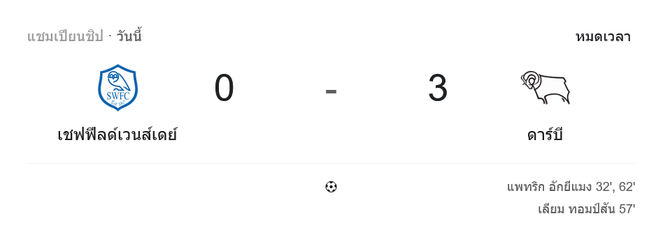เกมนี้ที่ฮิลส์โบโรห์ บ้านของเชฟฟิลด์ เว้นส์เดย์ เปิดบ้านรับการมาเยือนของ ดาร์บี้ เค้าท์ตี้ ในศึก EFL แชมเปียนชิป โดยแฟนบอลที่เช็กสกอร์ผ่านหน้าเว็บแนวสายบอลและเช็ก ผลบอลสด ต่างเห็นภาพเดียวกันคือ “แกะเขาเหล็ก” เล่นกันอย่างเฉียบคมและดุดันกว่าเจ้าถิ่นชัดเจน ก่อนปิดจ็อบด้วยสกอร์ขาดลอย 3-0