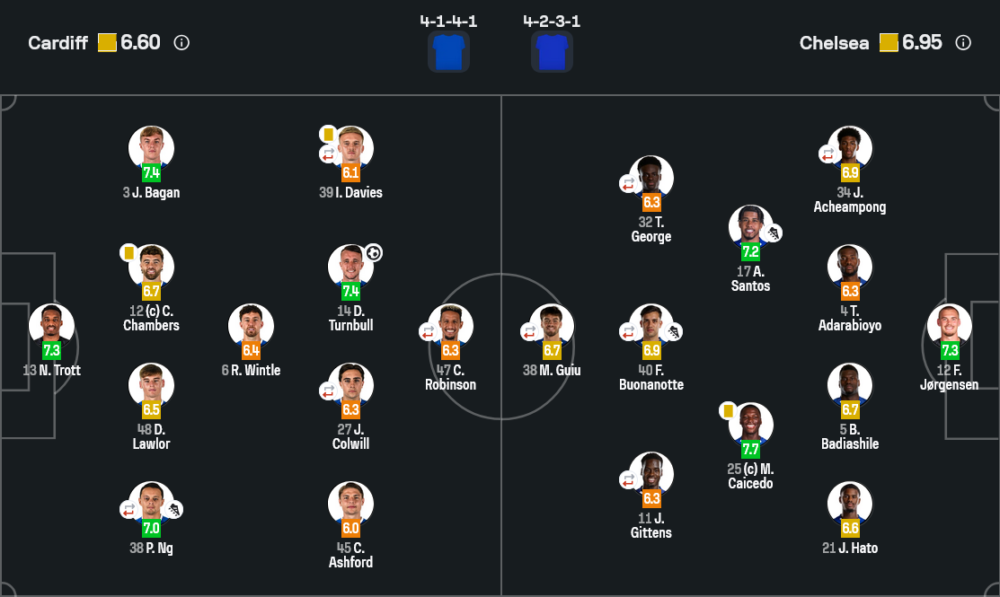 ฝั่งเชลซีใช้ 4-2-3-1 ดันฟูลแบ็กขึ้นสูง เน้นต่อบอลเท้าสู่เท้าให้แนวรุกสามตัวหลังหอกหมุนเวียนหาพื้นที่ ทั้งมาร์เซล กีอู, ทรีนิตี้ จอร์จ และฟากซุนโด บัวโนโนเต้ แต่จังหวะสุดท้ายยังไม่คมพอ หลายลูกติดบล็อกแนวรับคาร์ดิฟฟ์ ไม่ก็ไปจบที่เซฟของทร็อตต์