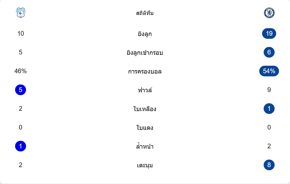 ตัวเลขหลังเกมบอกชัดว่าฝั่งเยือนคุมเกมได้อยู่หมัด เชลซีมีโอกาสยิงถึง 19 ครั้ง เข้ากรอบ 6 หน ขณะที่คาร์ดิฟฟ์ยิง 10 เข้ากรอบ 5 การครองบอลสิงห์บลูส์เหนือกว่าเล็กน้อยที่ 54% ต่อ 46% และบุกกดดันหนักจนได้ลูกเตะมุมถึง 8 ครั้ง มากกว่าเจ้าถิ่นที่มีเพียง 2 ครั้งเท่านั้น