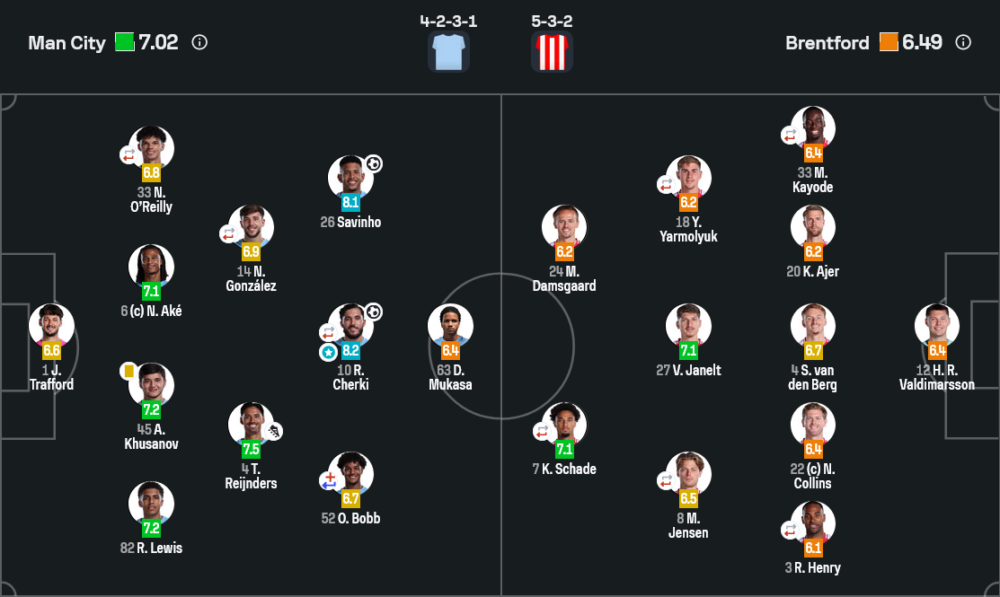 รางวัลแมนออฟเดอะแมตช์ต้องยกให้ รายาน แชร์กี หมายเลข 10 ของซิตี้อย่างไม่มีข้อกังขา แข้งเฟร้นช์แมนคนนี้ไม่เพียงยิงประตูปลดล็อกเกมในครึ่งแรก แต่ยังเป็นศูนย์กลางการสร้างสรรค์ทุกอย่างระหว่างเส้นกลางกับแดนหน้า การเลี้ยงกินตัวหนึ่ง–สองจังหวะของเขาทำให้แนวรับเบรนท์ฟอร์ดต้องถอยลึกอยู่ตลอด เปิดพื้นที่ให้เพื่อนร่วมทีมอย่างซาวินโญ่และโฟเดนได้หาพื้นที่ยิงมากขึ้น