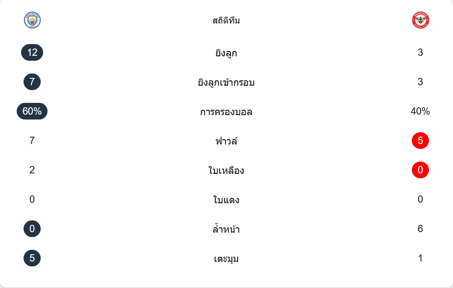 ตัวเลขหลังจบเกมสะท้อนภาพได้ชัดเจน แมนฯ ซิตี้ครองบอลถึง 60 เปอร์เซ็นต์ ควบคุมจังหวะและพื้นที่ในสนามอย่างเบ็ดเสร็จ ขณะที่เบรนท์ฟอร์ดมีเพียง 40 เปอร์เซ็นต์ ต้องใช้พลังไปกับการไล่บอลมากกว่าบุกใส่คู่แข่ง เจ้าถิ่นสร้างโอกาสยิงทั้งหมด 12 ครั้ง เข้ากรอบ 7 ครั้ง และเปลี่ยนเป็น 2 ประตู ส่วนทีมเยือนมีโอกาสยิงเพียง 3 ครั้ง แต่เข้ากรอบครบทั้ง 3 ทว่าความคมและจังหวะสุดท้ายยังไม่เฉียบคมพอจะผ่านมือทราฟฟอร์ดได้