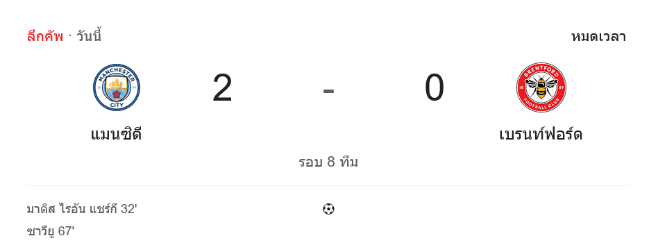 ค่ำคืนนี้แฟนบอลที่ตามเช็กสกอร์แบบ ผลบอลสด ต้องสะใจ เมื่อแมนเชสเตอร์ ซิตี้โรเตชันชุดผสมแต่ยังโหดพอเปิดเอติฮัด สเตเดียม อัดเบรนท์ฟอร์ด 2-0 ในรอบ 8 ทีมสุดท้าย ลีกคัพอังกฤษ เกมนี้รุกริมเส้นซ้าย–ขวาของเจ้าบ้านเล่นงานแนวรับผึ้งน้อยจนแทบหายใจไม่ทั่วท้อง ขณะที่ทีมเยือนต้องถอยไปตั้งรับลึกแทบทั้งเกม