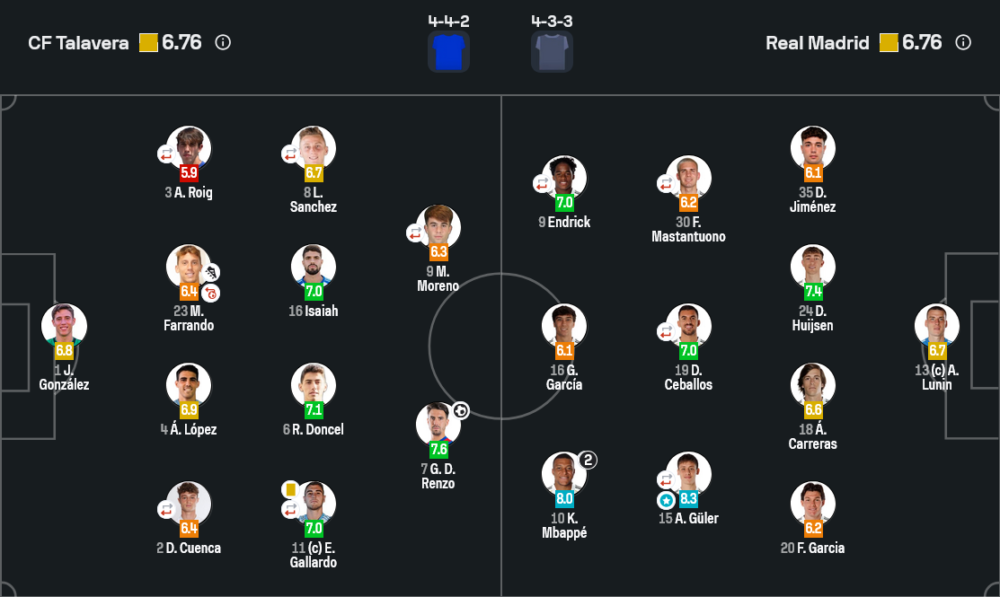 แม้จะไม่ได้ยิงหรือแอสซิสต์โดยตรง แต่ อาร์ดา กูเลอร์ คือหัวใจเกมรุกของเรอัลมาดริดตลอดเวลาที่อยู่ในสนาม ด้วยคะแนนเรตติ้งสูงถึง 8.3 เขาลงมาเชื่อมเกมฝั่งขวา คอยเลี้ยงจี้ดึงตัวประกบ เปิดพื้นที่ให้เอ็มบัปเป้และเอนดริกได้ทะลุช่องหลายครั้ง การครองบอลนิ่งและการจ่ายทะลุไลน์ที่เฉียบคม ทำให้แนวรับตาลาเบราต้องถอยลึกอยู่ตลอด