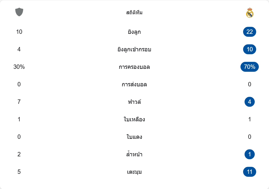 ตัวเลขหลังเกมเผยให้เห็นภาพชัดว่าเรอัลมาดริดคุมเกมแทบทั้งหมด พวกเขายิงรวมถึง 22 ครั้ง เข้ากรอบ 10 ครั้ง ขณะที่ตาลาเบรายิงได้ 10 ครั้ง เข้ากรอบ 4 ครั้ง ทีมเยือนครองบอลสูงถึง 70% ต่อ 30% เล่นแบบต่อบอลไปมารอจังหวะเจาะ ขณะที่เจ้าถิ่นเน้นตั้งรับลึกแล้วสวนกลับเป็นหลัก