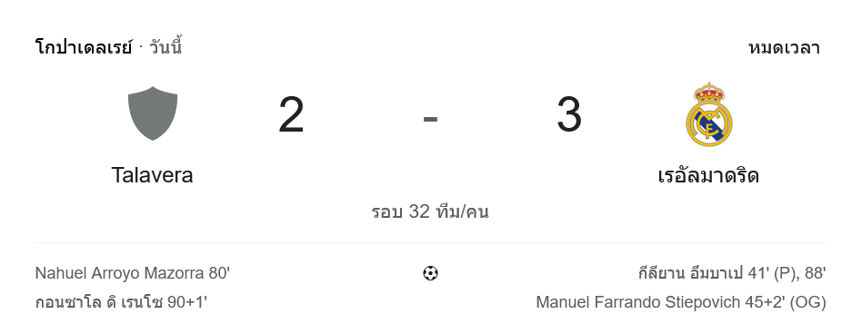 - 🔔 จบเกม – ซีเอฟ ตาลาเบรา เด ลา เรย์นา พ่าย เรอัลมาดริด 2-3 ตกรอบอย่างสมศักดิ์ศรี