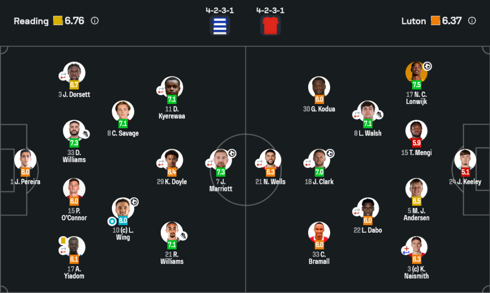 รางวัล Player of the match อย่างไม่ต้องสงสัยตกเป็นของ ลูอิส วิงก์ มิดฟิลด์กัปตันเร้ดดิ้ง ที่ได้คะแนนสูงสุด 8.0 จากการยิงจุดโทษขึ้นนำให้ทีมตั้งแต่ต้นเกม แถมตลอด 90 นาทีเจ้าตัวคือคนที่คุมจังหวะบุก–รับของทีม คอยเชื่อมบอลจากหลังขึ้นหน้า เปลี่ยนแกนเกมรุกได้แม่นยำ และช่วยให้เร้ดดิ้งไม่เสียสมดุลแม้ช่วงที่โดนบุกหนัก ถือเป็นผู้นำตัวจริงในแดนกลางที่ทำให้เพื่อนร่วมทีมเล่นง่ายขึ้นอย่างเห็นได้ชัด