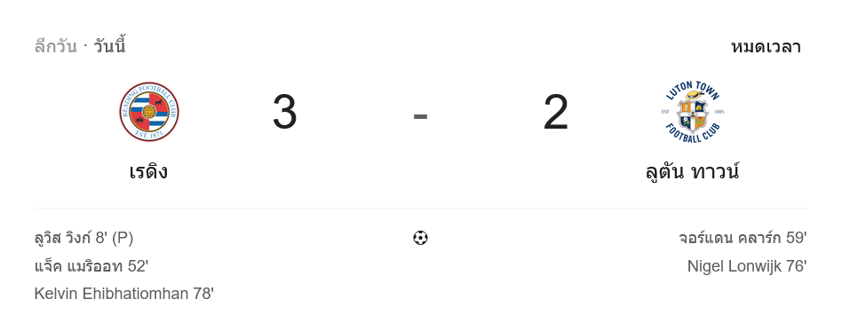 ท้ายเกมลูตันพยายามเร่งเครื่องเต็มที่ แต่โดน Reading ถ่วงจังหวะ และเกมรับยืนกันอย่างเหนียวแน่น ช่วงทดเวลา 5 นาที เอลิบาติฮอมานมาโดนใบเหลืองจากการฟาวล์ตัดเกม ทว่าก็ช่วยให้เจ้าบ้านรักษาสกอร์ไว้ได้ จบเกม เร้ดดิ้งเปิดบ้านเฉือนลูตัน ทาวน์ 3-2 แบบสุดมันส์ในสไตล์ บ้านผลบอล ตัวจริง