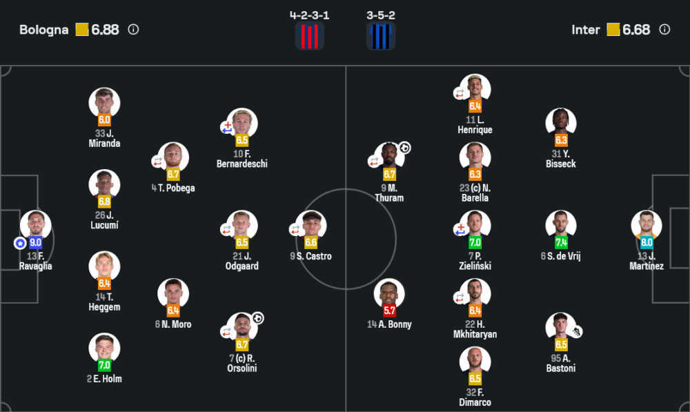 ตำแหน่งฮีโร่ของค่ำคืนนี้ต้องยกให้ Federico Ravaglia นายด่านโบโลญญ่าอย่างไร้ข้อกังขา เรตติ้งสูงลิ่วถึง 9.0 สะท้อนผลงานแบบวันพระของแท้ เขาเซฟลูกยิงอันตรายของอินเตอร์หลายครั้ง ทั้งลูกยิงไกลของมิดฟิลด์และช็อตจ่อๆ จากคู่หัวหอก ช่วยให้ทีมรอดพ้นจากการโดนแซงนำในช่วงสำคัญ