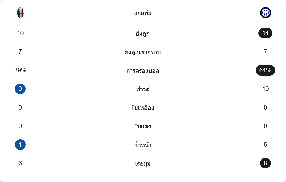 ตัวเลขหลังเกมบอกชัดว่าอินเตอร์เป็นฝ่ายเดินหน้ากดดันมากกว่า ทีมเยือนมีโอกาสยิงทั้งสิ้น 14 ครั้ง เข้ากรอบ 7 เท่ากับโบโลญญ่า แต่ครองบอลเหนือกว่าชัดเจนถึง 61% ขณะที่เจ้าถิ่นครองบอลแค่ 39% ต้องใช้เกมรับตัวต่ำสวนกลับเป็นหลัก แม้จะถูกบุกอย่างต่อเนื่อง แต่โบโลญญ่ากลับมีประสิทธิภาพในพื้นที่สุดท้ายดีทีเดียว ยิงเข้ากรอบ 7 จาก 10 ครั้ง แสดงให้เห็นว่าทุกครั้งที่มีโอกาสพวกเขาแทบไม่ทิ้งให้เสียเปล่า