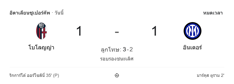 🎯 ดวลจุดโทษท้ายเกม โบโลญญ่าทำได้แม่นยำกว่า ยิงเข้า 3 ประตู ส่วนอินเตอร์ยิงเข้าเพียง 2 ทำให้โบโลญญ่าชนะในการดวลโทษ 3-2 หลังเสมอในเวลา 1-1 ทะลุเข้าชิงซูแปร์โกปปาอีตาเลียนากับนาโปลี