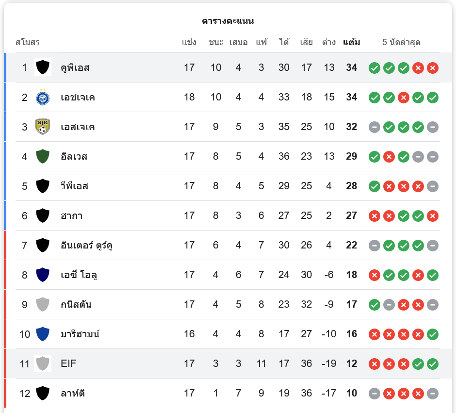ตารางคะแนนล่าสุด หลังจากการแข่งขัน คูพีเอส ยังคงครองตำแหน่งจ่าฝูงด้วยคะแนน 34 แต้ม จากการลงเล่น 17 นัด ส่วน อีคีนาส ไอเอฟ ฟุตบอล ยังคงอยู่อันดับที่ 11 ด้วยคะแนน 12 แต้ม