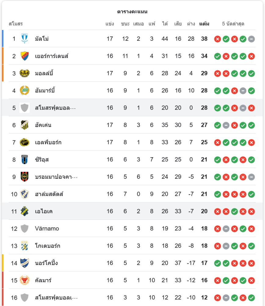 ตารางคะแนนล่าสุด หลังจากการแข่งขัน มัลโม่ ยังคงครองตำแหน่งจ่าฝูงด้วยคะแนน 38 แต้มจากการลงเล่น 17 นัด ส่วน เอไอเค โซลน่า ยังคงอยู่อันดับที่ 11 ด้วยคะแนน 20 แต้ม