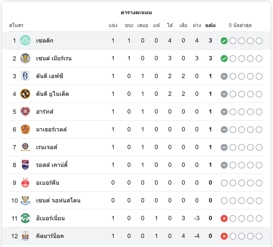 ทีมที่อยู่ในอันดับถัดไปคือเซนต์ เมียร์เรน และดันดี เอฟซี ที่มีคะแนนตามลำดับเป็น 3 คะแนนเท่ากัน แต่ตามหลังเซลติกในผลต่างประตูได้เสีย ขณะที่ทีมที่อยู่ในอันดับล่างสุดของตารางคือคิลมาร์น็อค ที่ยังไม่มีคะแนนจากการลงเล่น 1 นัด