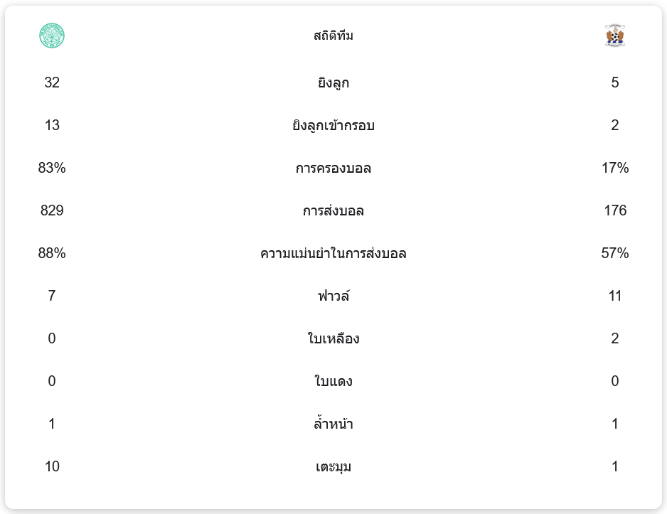 สถิติทีม ทีมเซลติกมีการยิงทั้งหมด 32 ครั้ง โดยยิงเข้ากรอบ 13 ครั้ง พวกเขาครองบอลได้ 83% และมีการส่งบอลถึง 829 ครั้งด้วยความแม่นยำ 88% การทำฟาวล์ทั้งหมด 7 ครั้ง ไม่มีใบเหลือง ไม่มีใบแดง ได้เตะมุม 10 ครั้ง และล้ำหน้า 1 ครั้ง