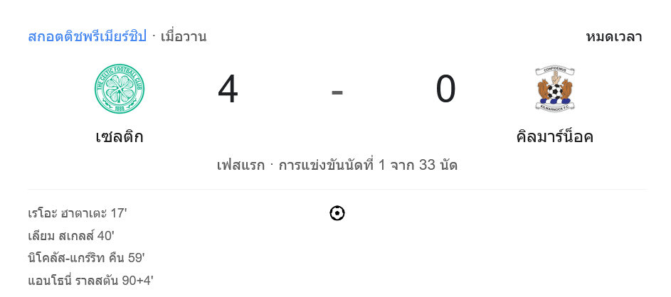 สรุปผลและผลกระทบต่อทีม ด้วยชัยชนะในนัดนี้ เซลติกยังคงรักษาตำแหน่งจ่าฝูงของตารางคะแนน สกอตติชพรีเมียร์ชิป ได้ โดยมีคะแนนนำห่างทีมอื่น ๆ ในลีก ขณะที่คิลมาร์น็อคต้องพยายามกลับมาแก้ไขฟอร์มการเล่นเพื่อรักษาตำแหน่งในตารางต่อไป การแข่งขันนัดนี้แสดงให้เห็นถึงความสามารถและความมุ่งมั่นของทีมเซลติกในการทำประตูและคว้าชัยชนะ