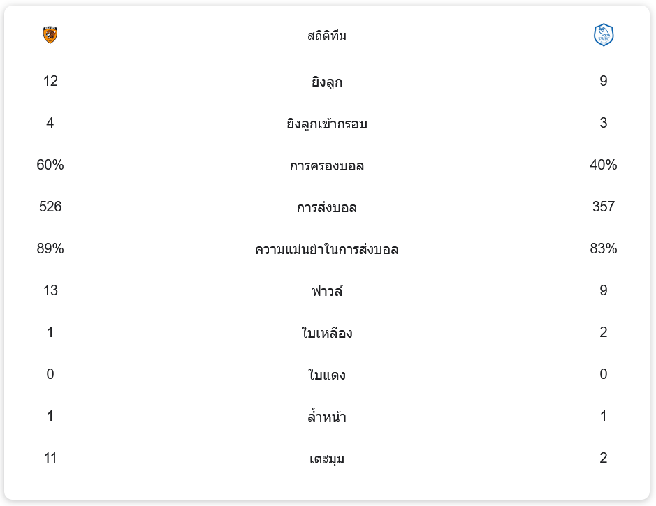 สถิติทีม ทีม ฮัลล์ ซิตี้ มีการยิงทั้งหมด 12 ครั้ง โดยยิงเข้ากรอบ 4 ครั้ง พวกเขาครองบอลได้ 60% และมีการส่งบอลทั้งหมด 526 ครั้งด้วยความแม่นยำ 89% การทำฟาวล์ทั้งหมด 13 ครั้ง ได้รับใบเหลือง 1 ใบ ไม่มีใบแดง ได้เตะมุม 11 ครั้ง และล้ำหน้า 1 ครั้ง