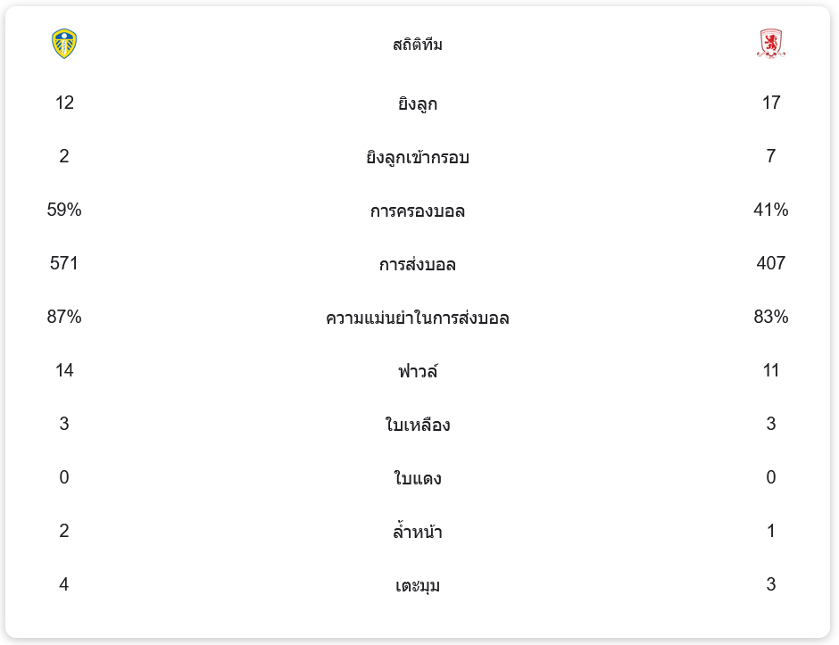 • ลีดส์ ยูไนเต็ด: ยิงทั้งหมด 12 ครั้ง ยิงเข้ากรอบ 2 ครั้ง ครองบอล 59% การส่งบอล 571 ครั้ง ความแม่นยำในการส่งบอล 87% ทำฟาวล์ 14 ครั้ง ได้รับใบเหลือง 3 ใบ ไม่มีใบแดง ล้ำหน้า 2 ครั้ง และได้เตะมุม 4 ครั้ง