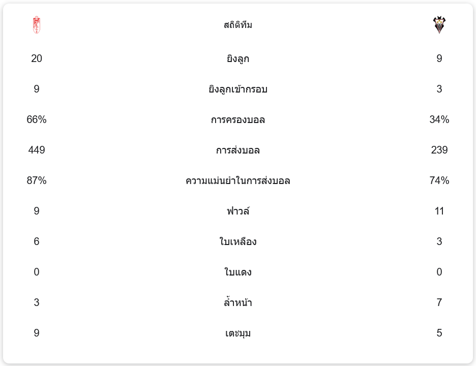 ทีม กรานาดา ซีเอฟ มีการยิงทั้งหมด 20 ครั้ง โดยยิงเข้ากรอบ 9 ครั้ง ครองบอลได้ 66% และมีการส่งบอลทั้งหมด 449 ครั้งด้วยความแม่นยำ 87% การทำฟาวล์ทั้งหมด 9 ครั้ง ได้รับใบเหลือง 6 ใบ ไม่มีใบแดง ได้เตะมุม 9 ครั้ง และล้ำหน้า 3 ครั้ง